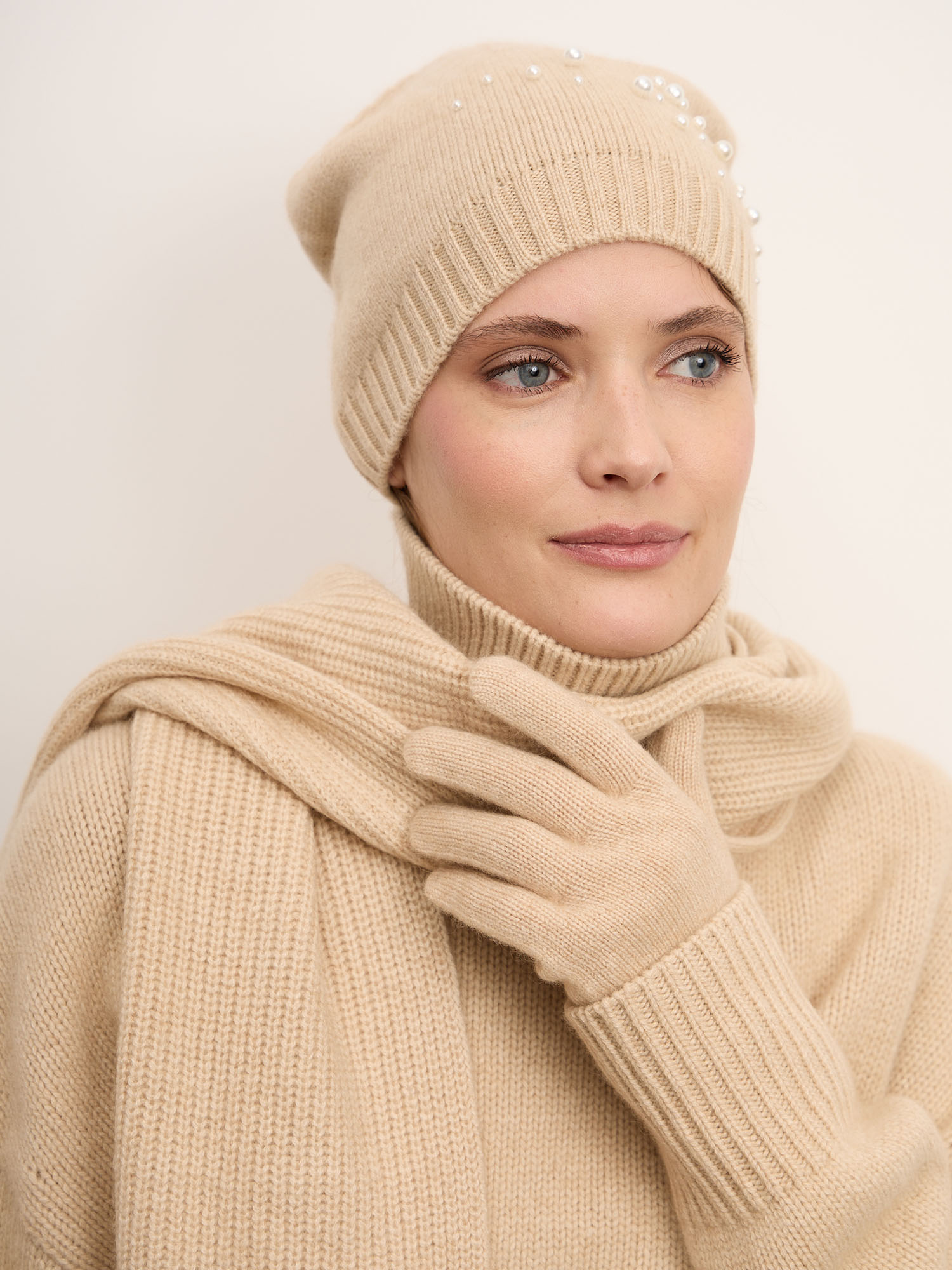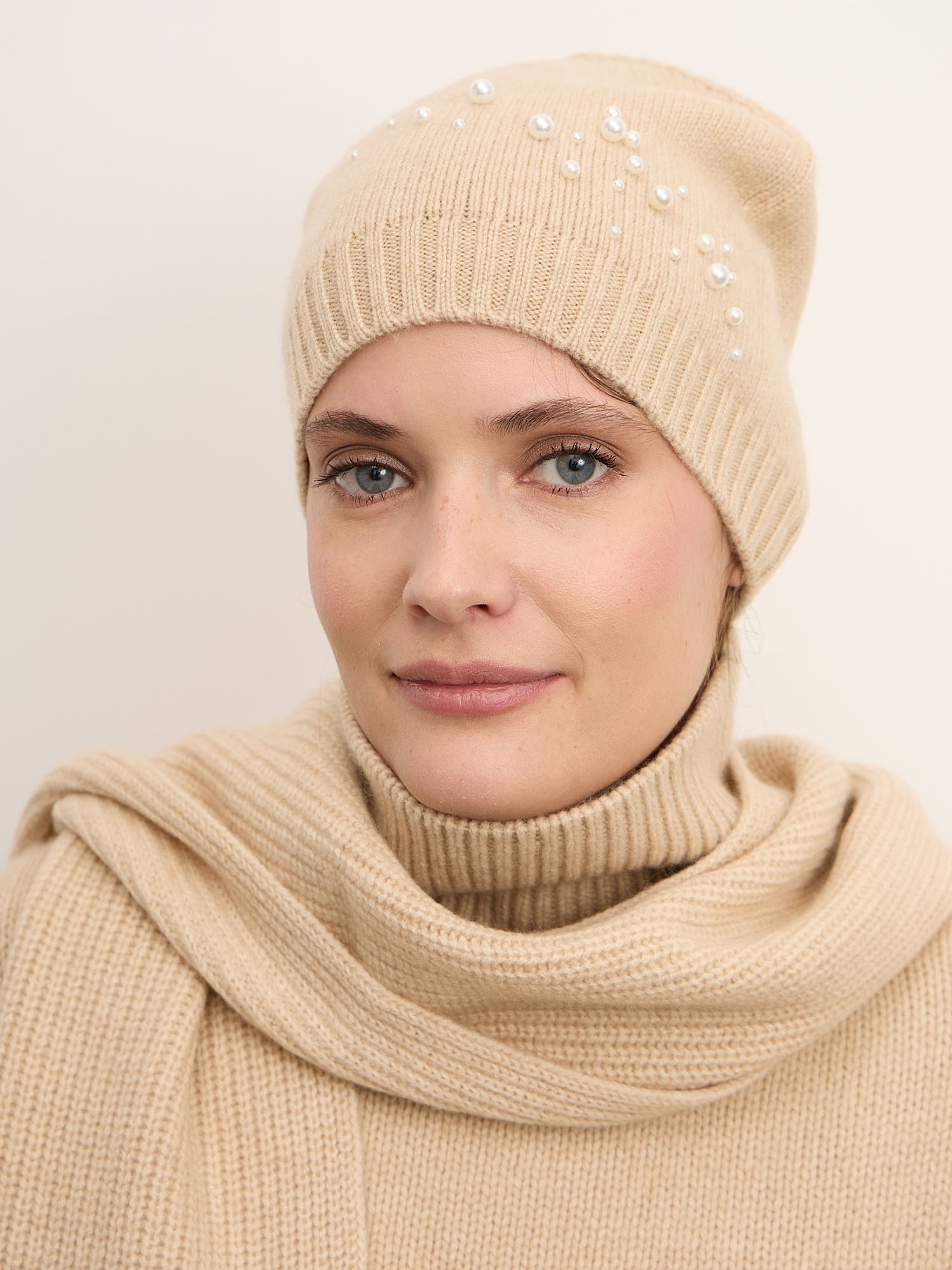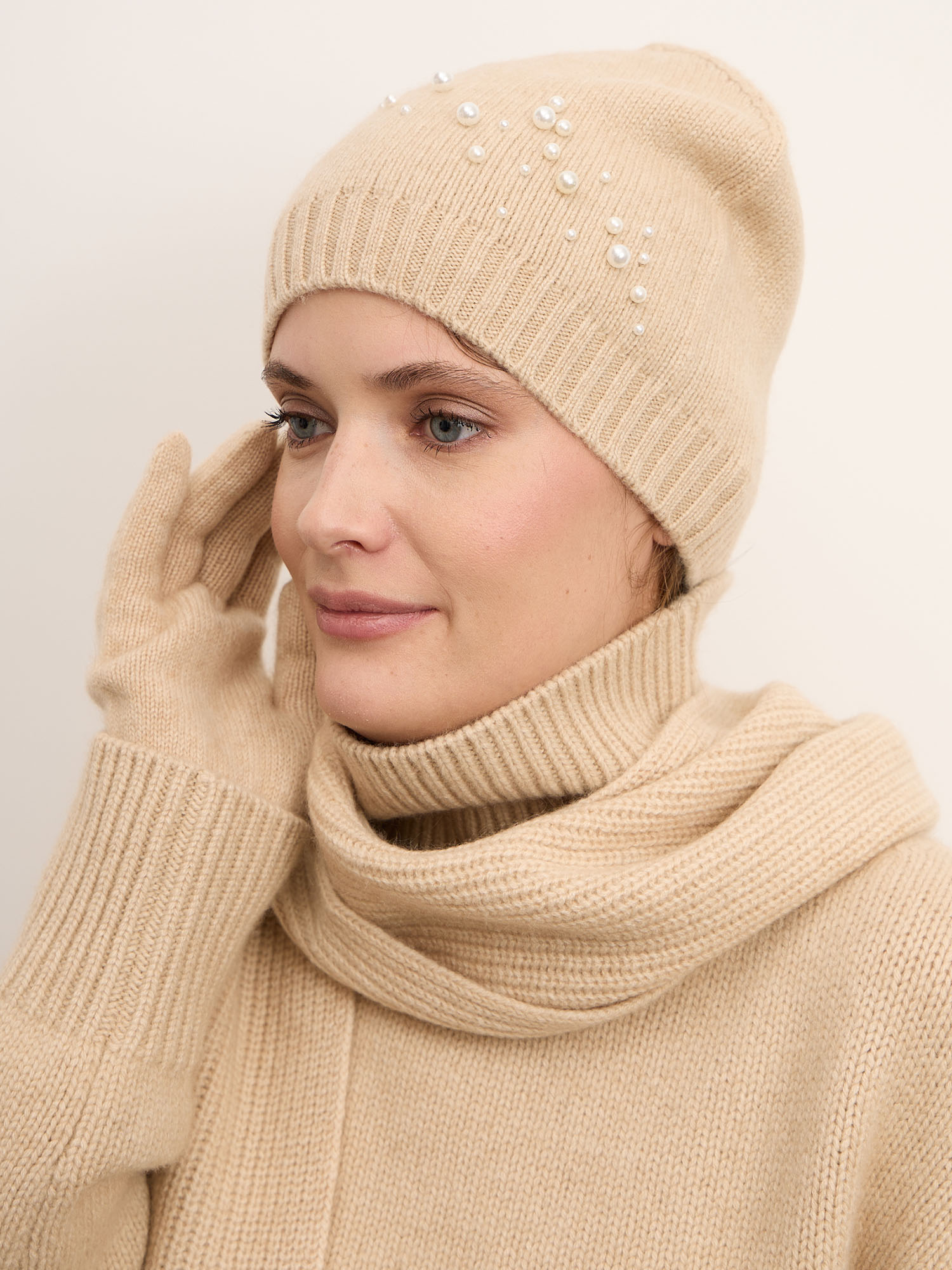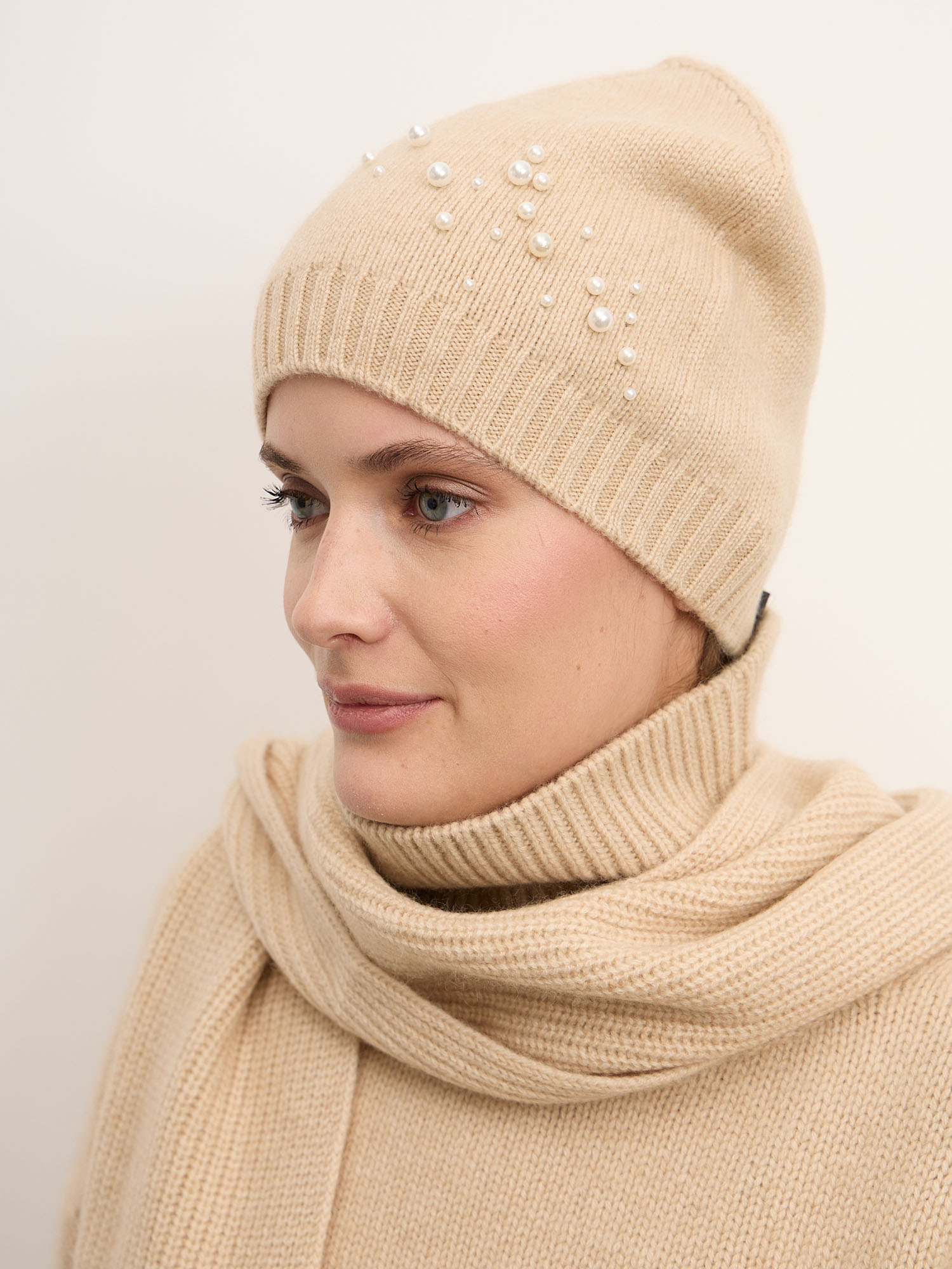 Классическая вязаная модель с аккуратной резинкой по краю и гладкой верхней частью. Декоративные жемчужные элементы добавляют изящества и легкого сияния, не перегружая образ. Лаконичный силуэт и продуманная плотность вязки обеспечивают аккуратный внешний вид и устойчивость формы.