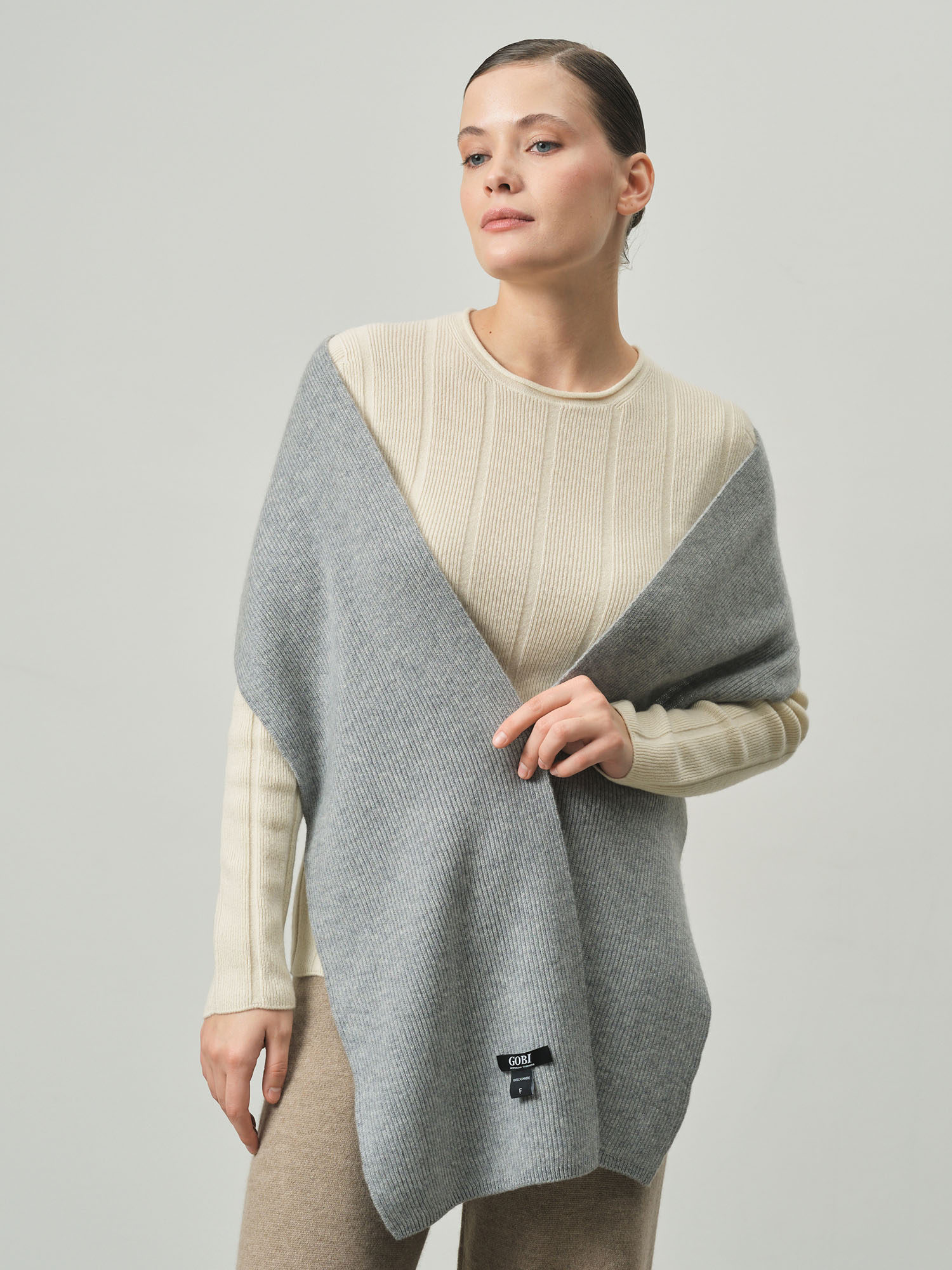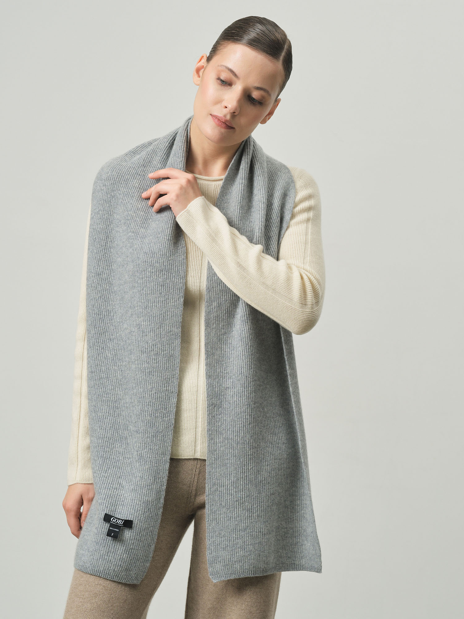 Классическая прямоугольная форма с фактурной вязкой в рубчик. Минималистичный дизайн подчёркивает благородную текстуру кашемира и делает шарф универсальным аксессуаром для разных стилей.