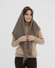 Треугольная форма косынки с фактурной вязкой и аккуратным полосатым рисунком. По краям изделие дополнено декоративной бахромой, которая придаёт аксессуару динамичность и лёгкость. Косынка красиво драпируется и сохраняет форму.