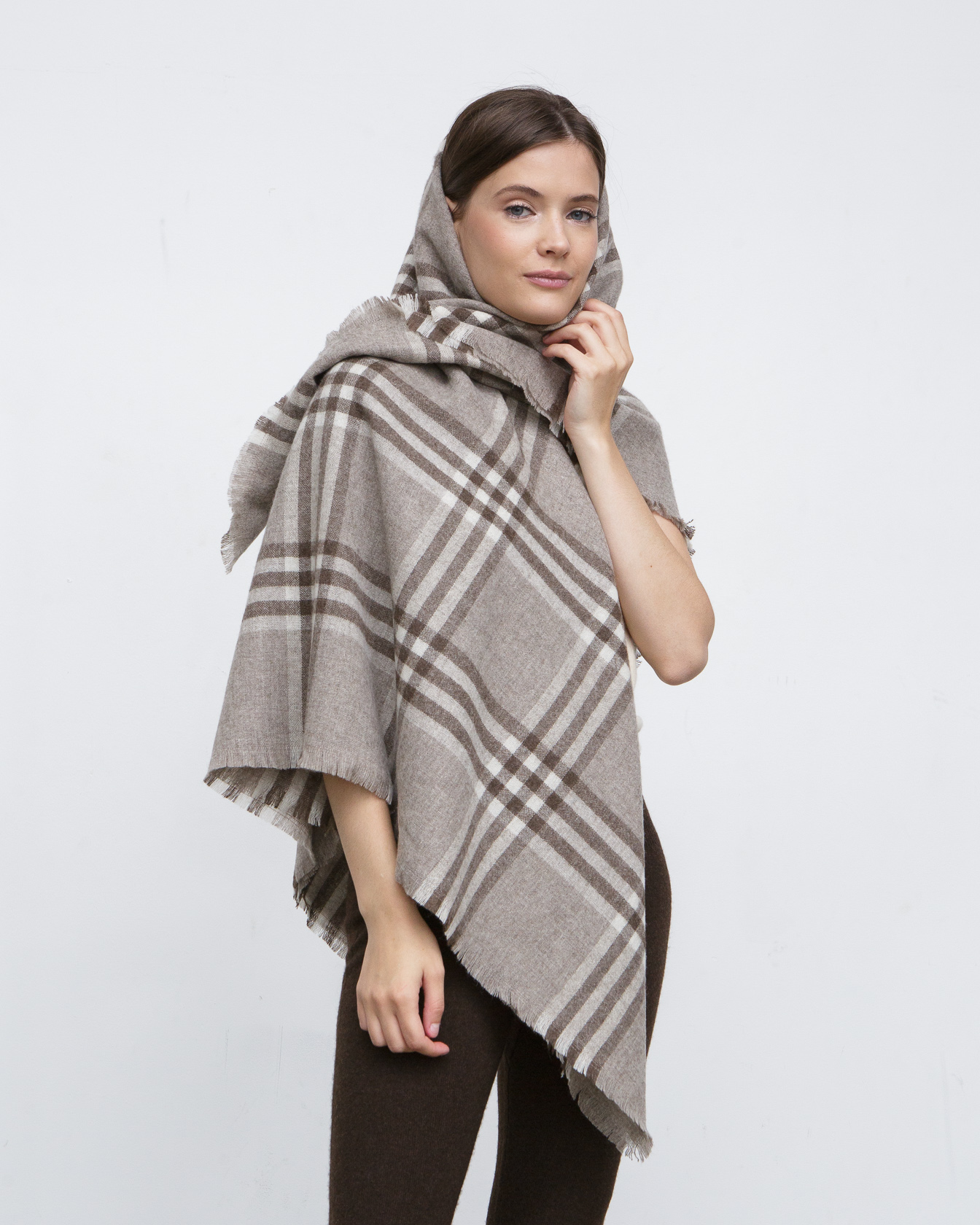Модель выполнена в форме крупной косынки с эффектным клетчатым узором. Свободная форма позволяет носить платок различными способами — на плечах, вокруг шеи или в виде накидки, создавая разные стилистические решения.