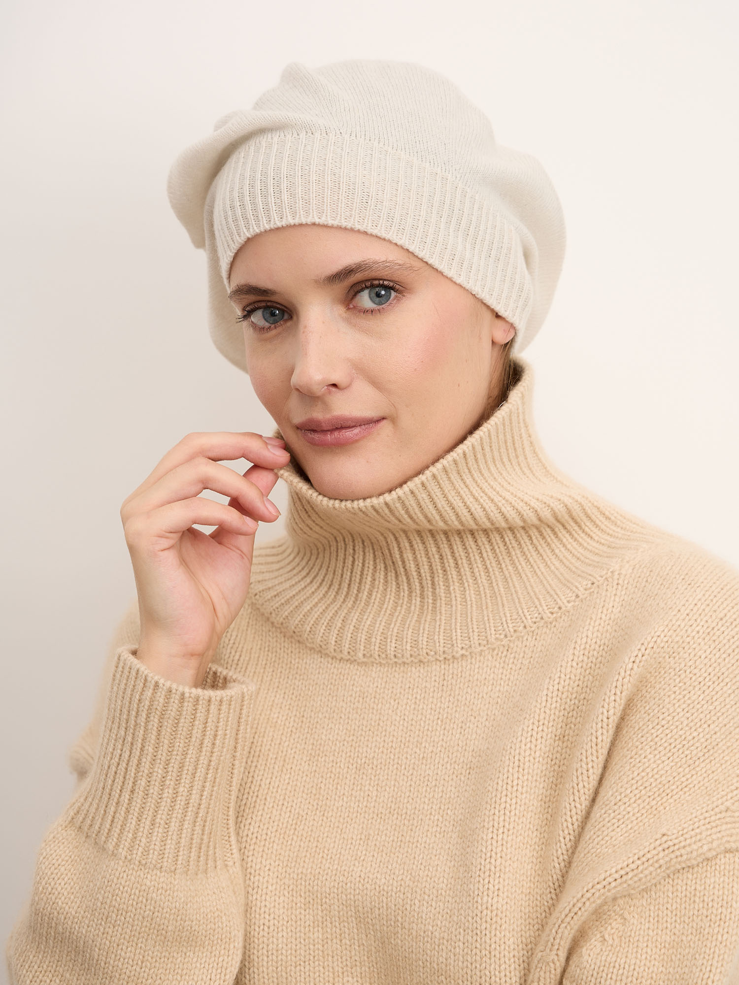 Классическая форма берета с мягкой драпировкой и аккуратной эластичной резинкой по краю. Лаконичное исполнение без декоративных элементов делает модель универсальной и актуальной вне времени. Пластичная структура позволяет носить берет в разных вариантах — слегка сместив на бок или оставив объем сзади.