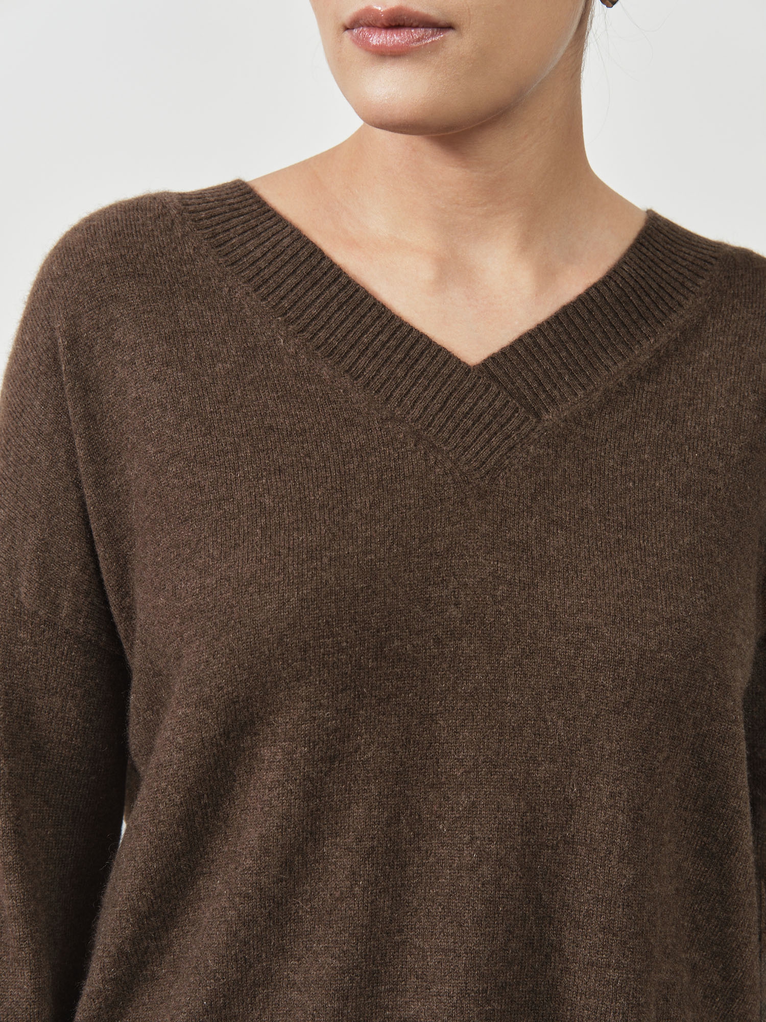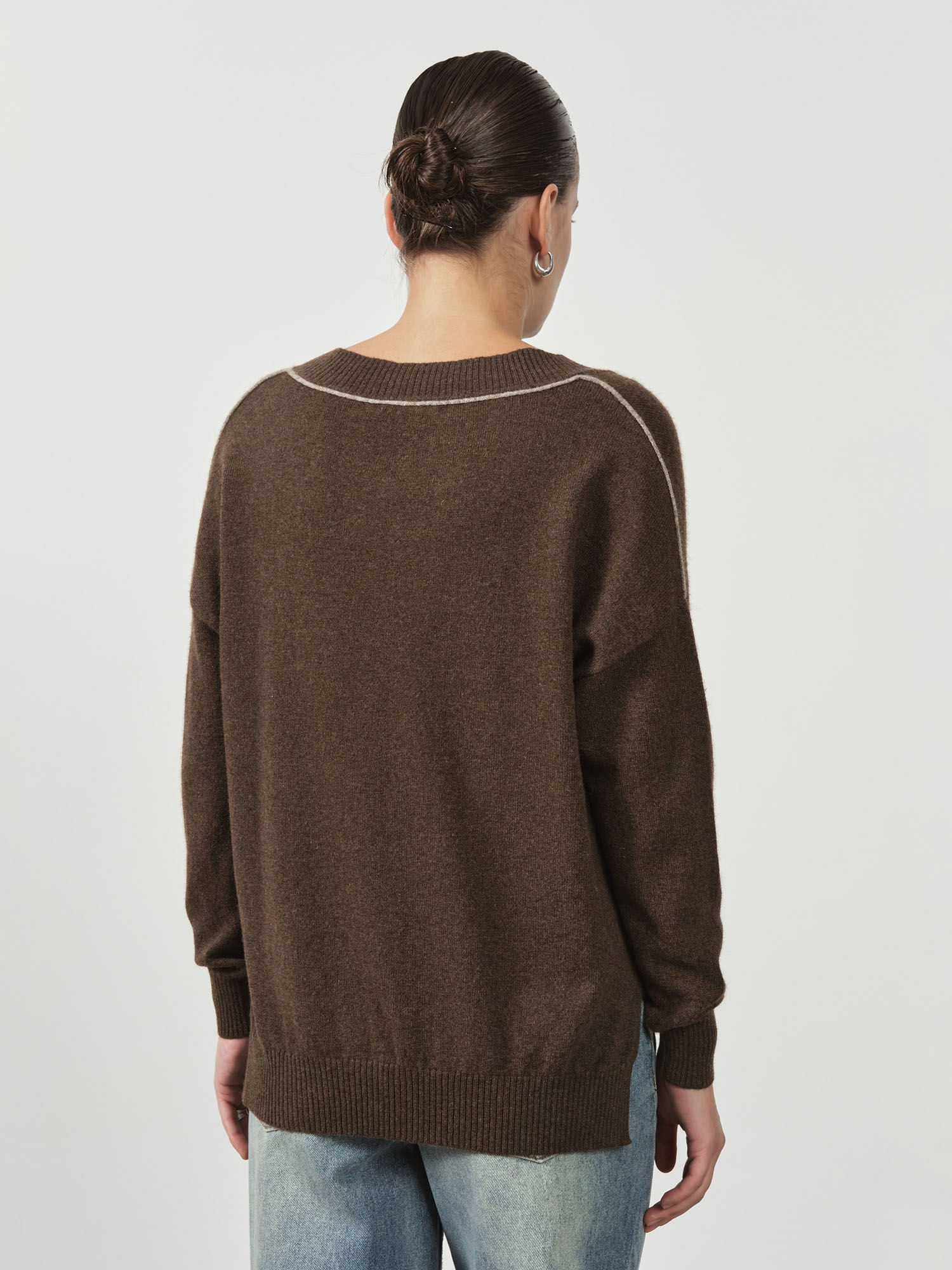 Модель выполнена в минималистичном стиле с V-образным вырезом и длинными рукавами. Свободный крой подчёркивает современный силуэт и делает джемпер удобным для повседневной носки.