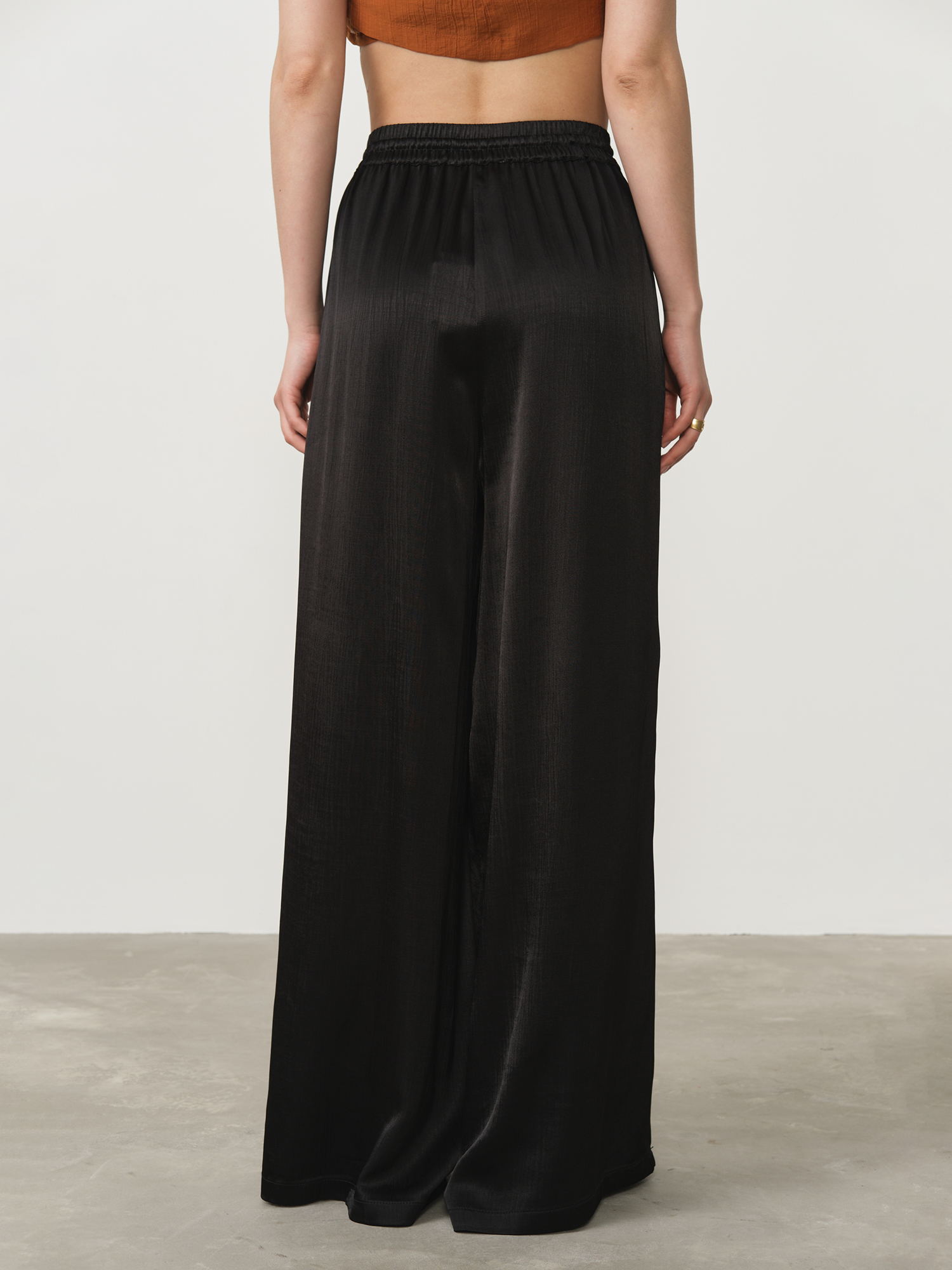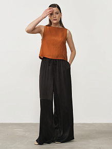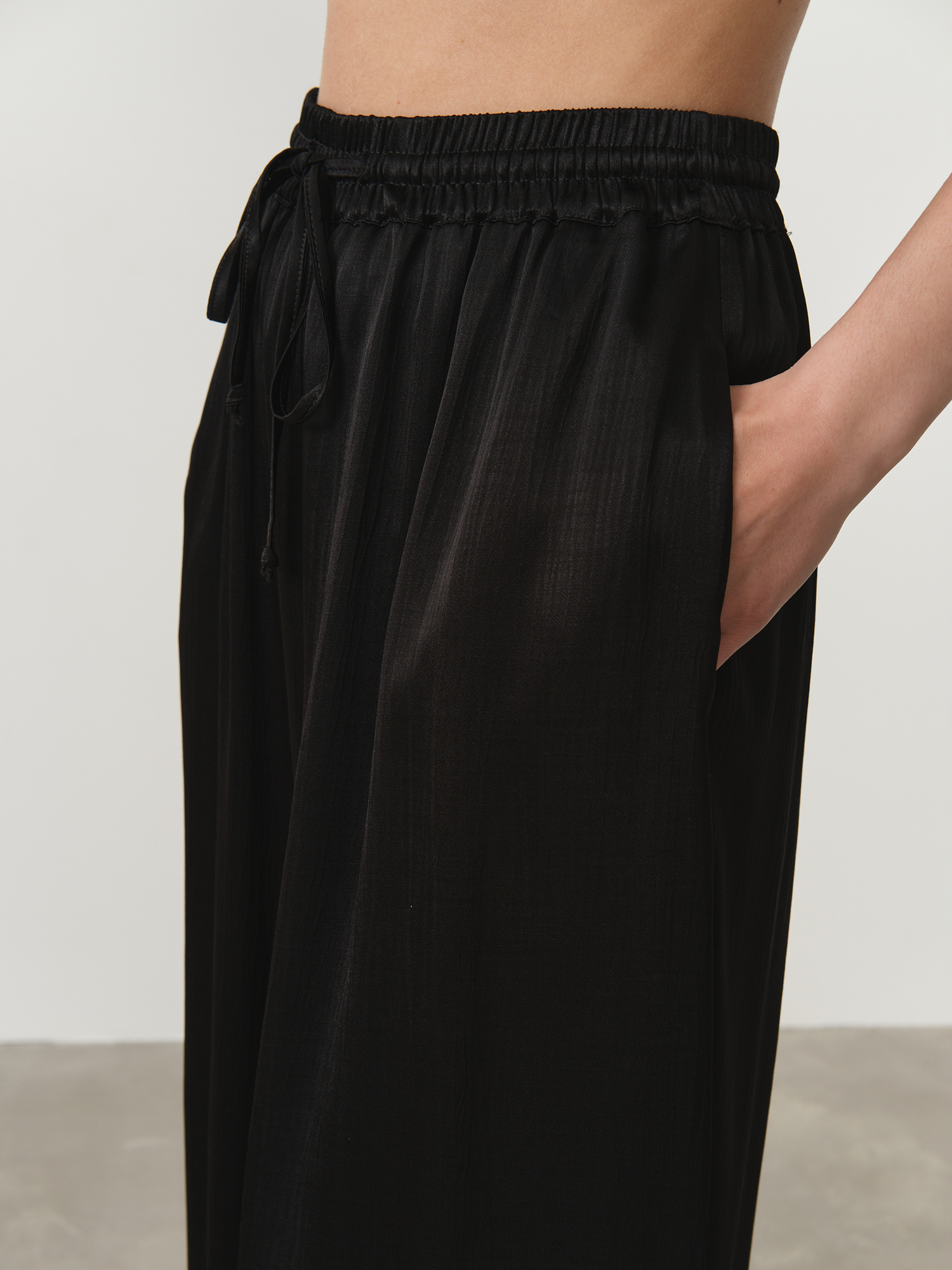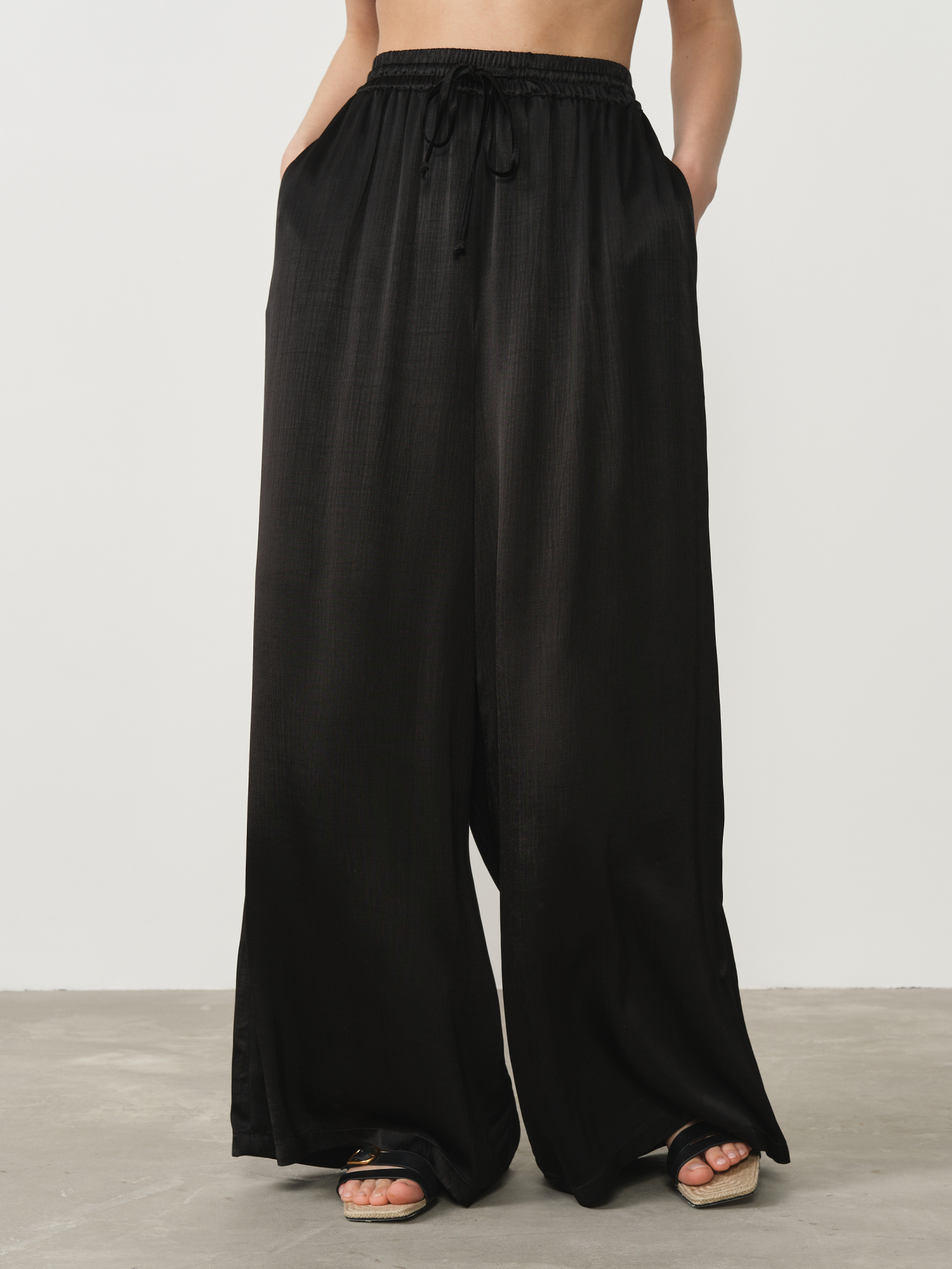 Эластичный пояс с кулиской для регулировки посадки, боковые карманы, мягкая струящаяся ткань, аккуратные швы.