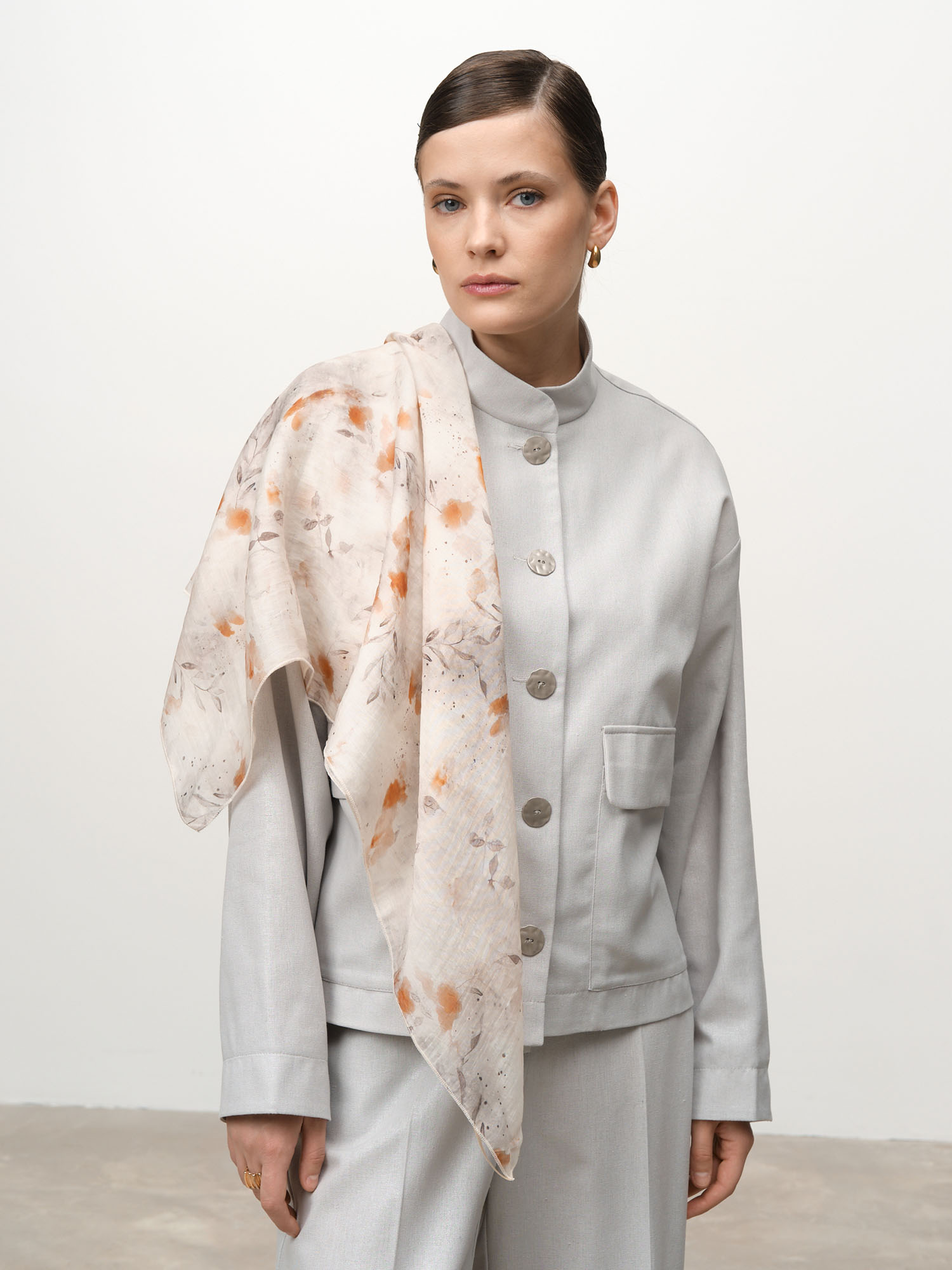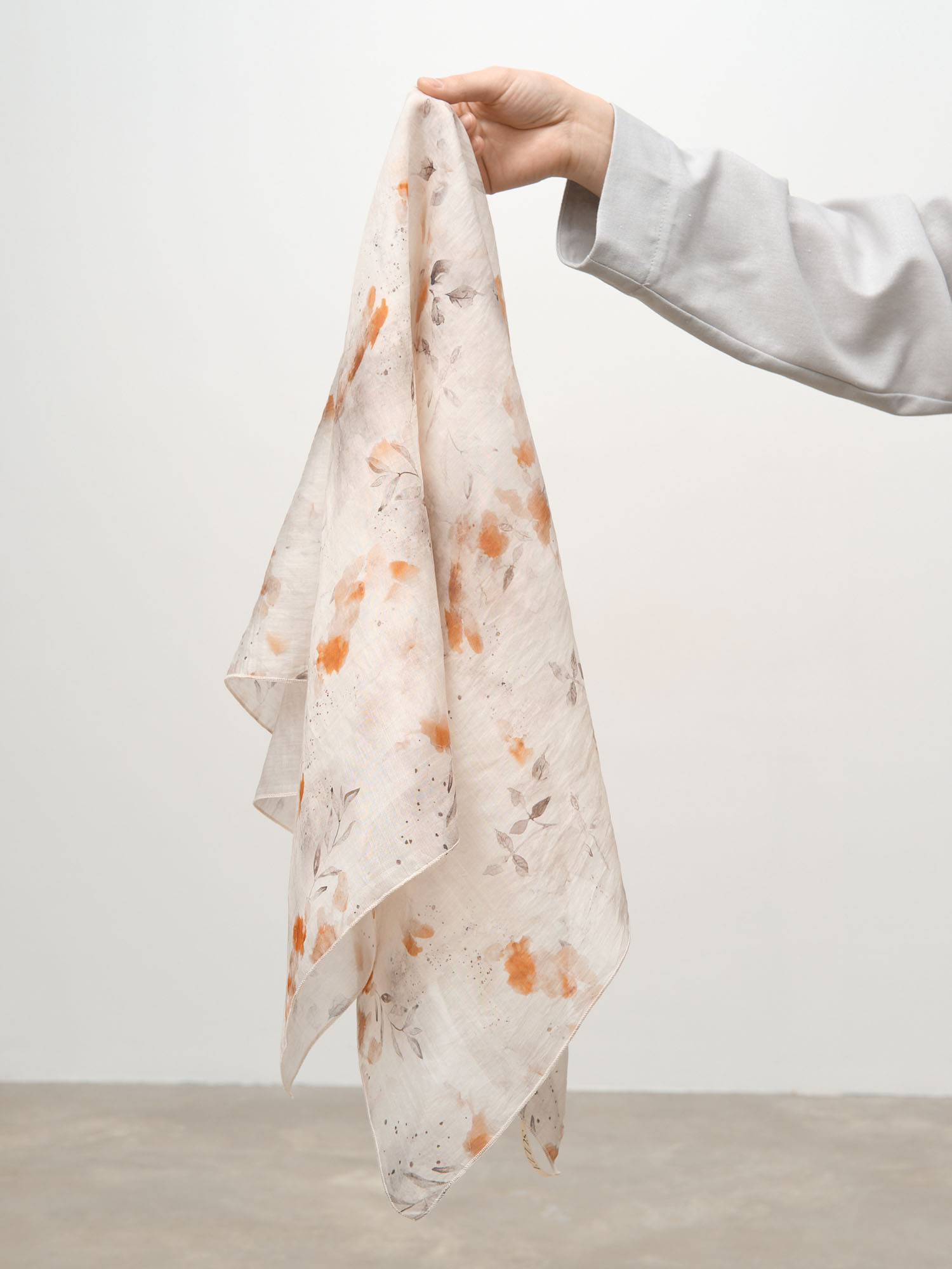 Платок с деликатным принтом и аккуратной обработкой краёв. Лёгкая, струящаяся фактура красиво драпируется и позволяет создавать разные варианты ношения.