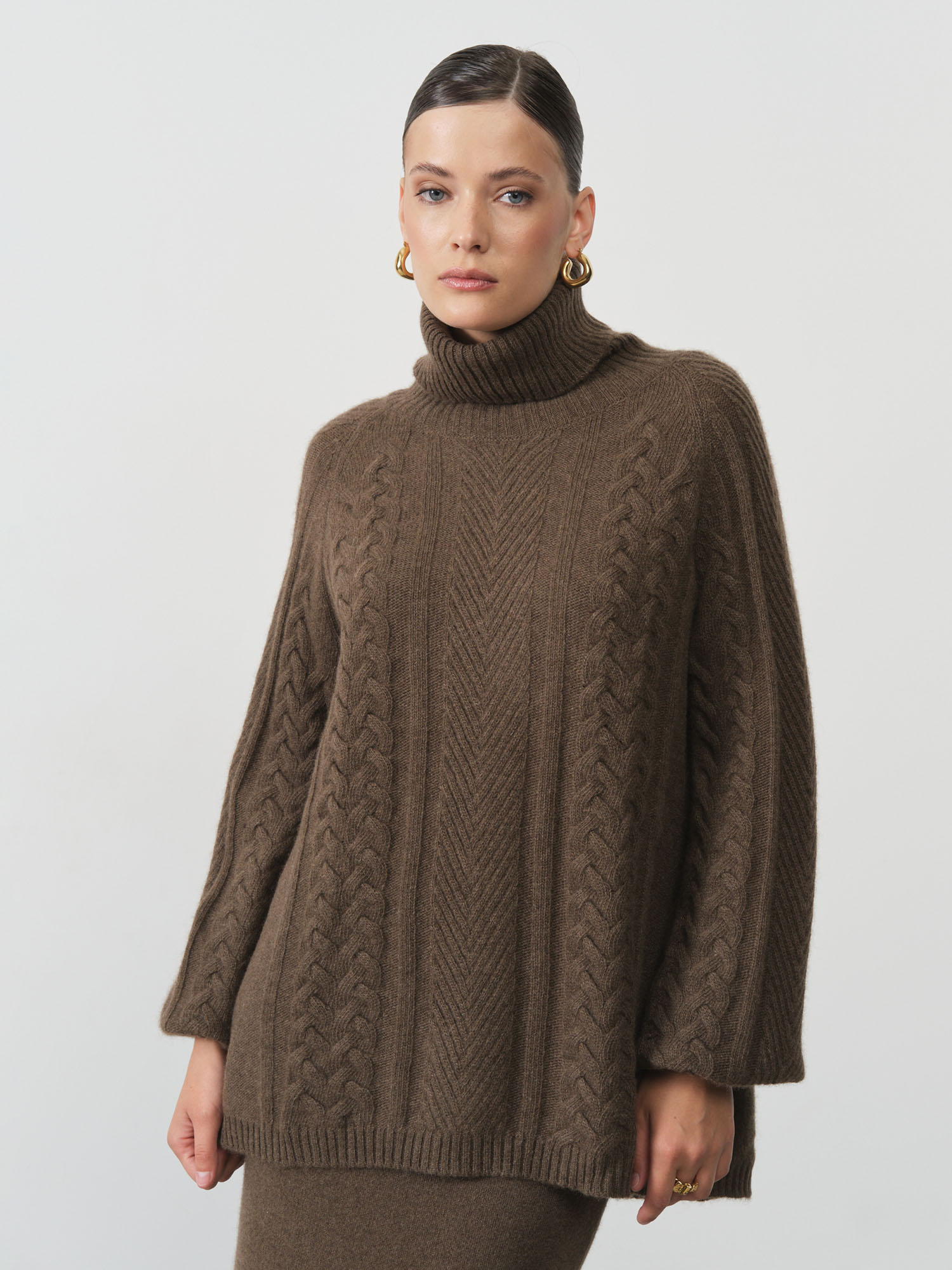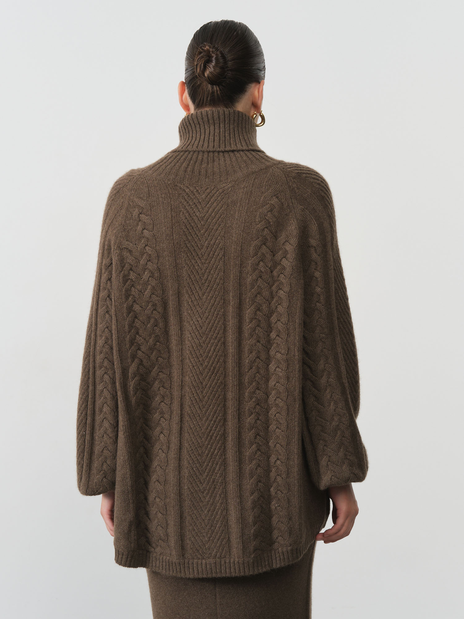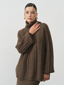 Модель выполнена с высоким воротником и свободным силуэтом. Свитер украшен рельефной вязкой с косами и геометрическими элементами, которые придают изделию объёмную текстуру и выразительный характер.