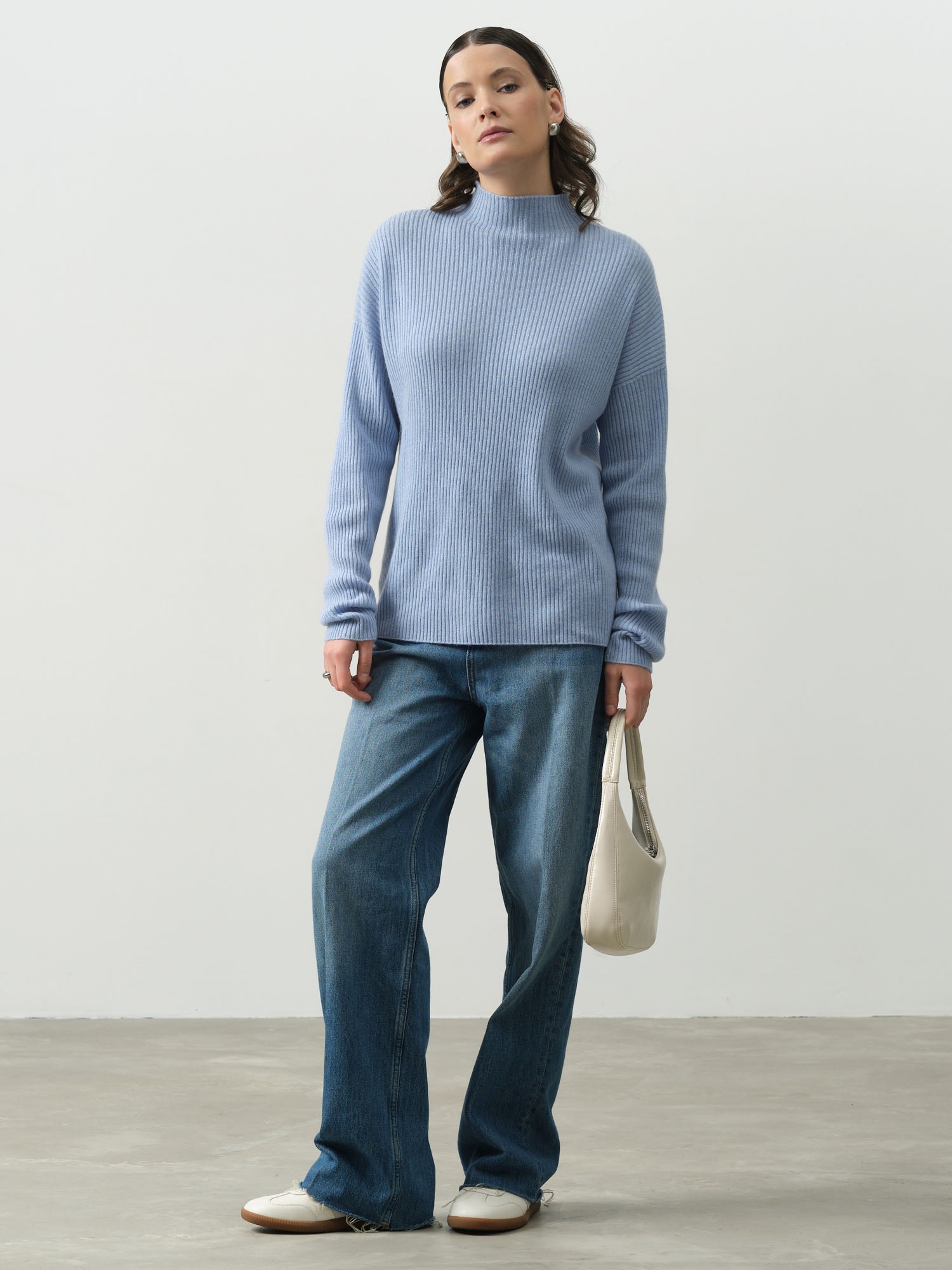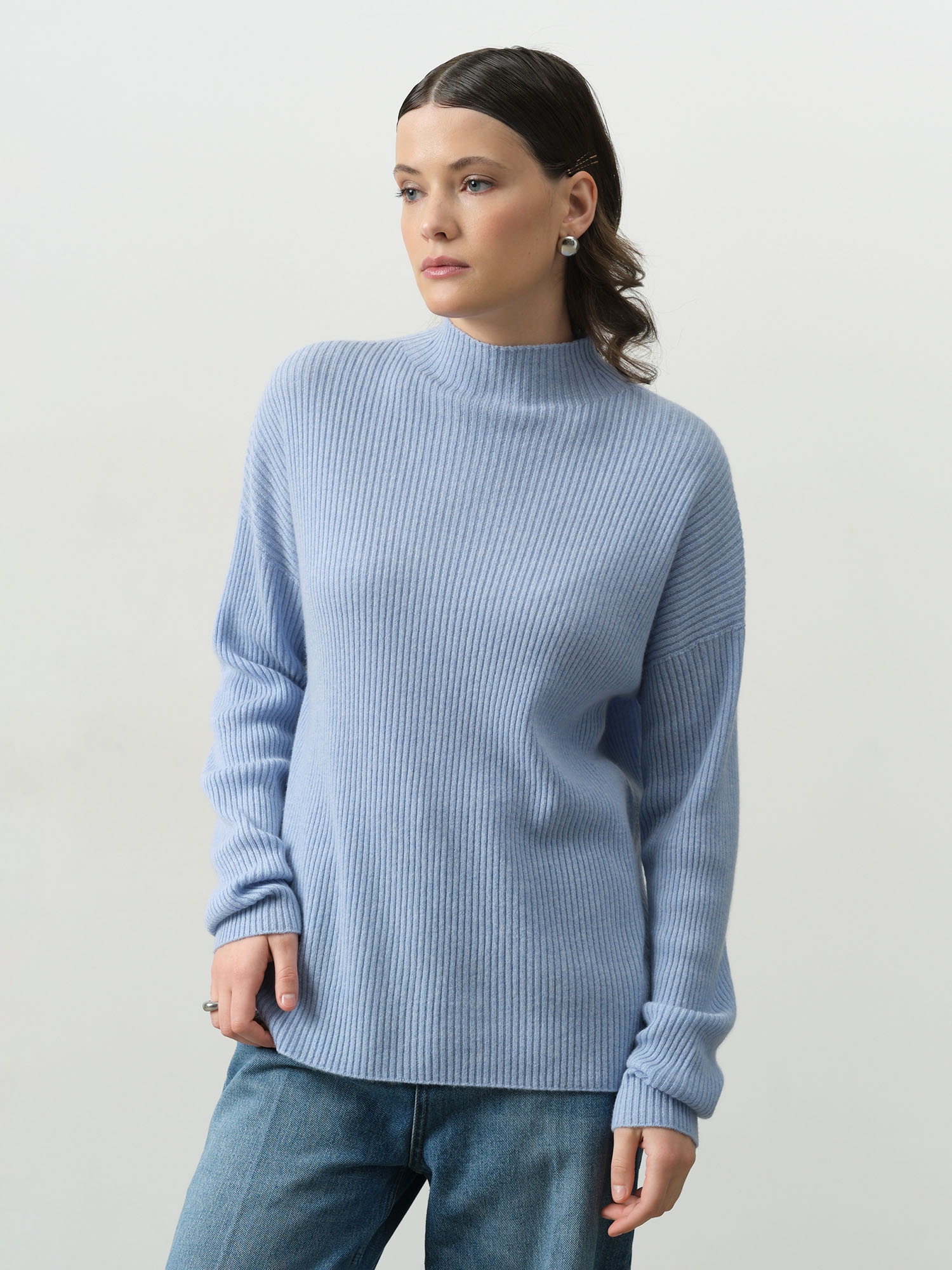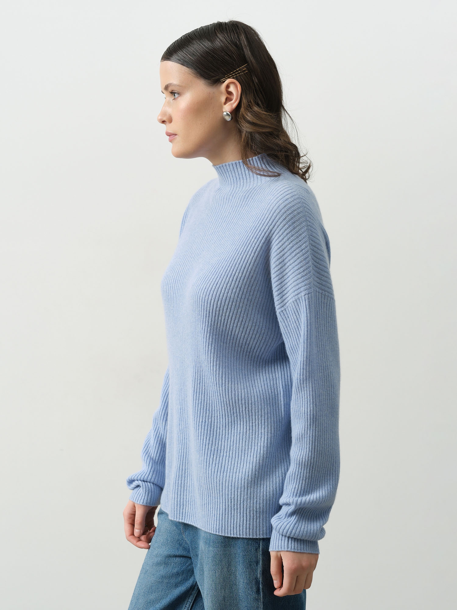 Очень приятный свитер нежно голубого цвета. Но мне показался коротковат. Не хватает как будто нескольких сантиметров. Хотя в остальном размеры нормальные. И рукава, и горло, и обхват в целом. Тактильно не к чему придраться. Кашемир есть кашемир.