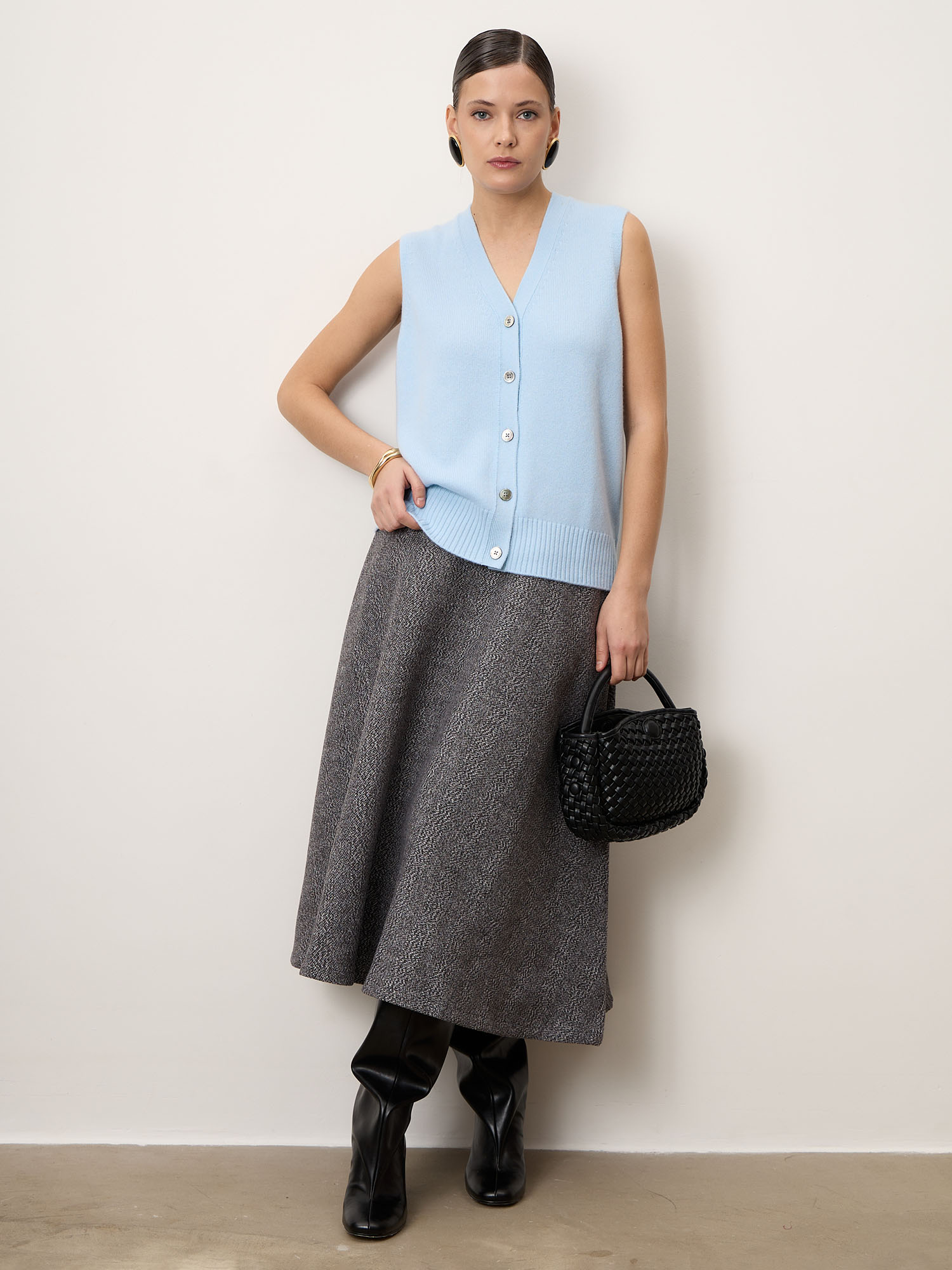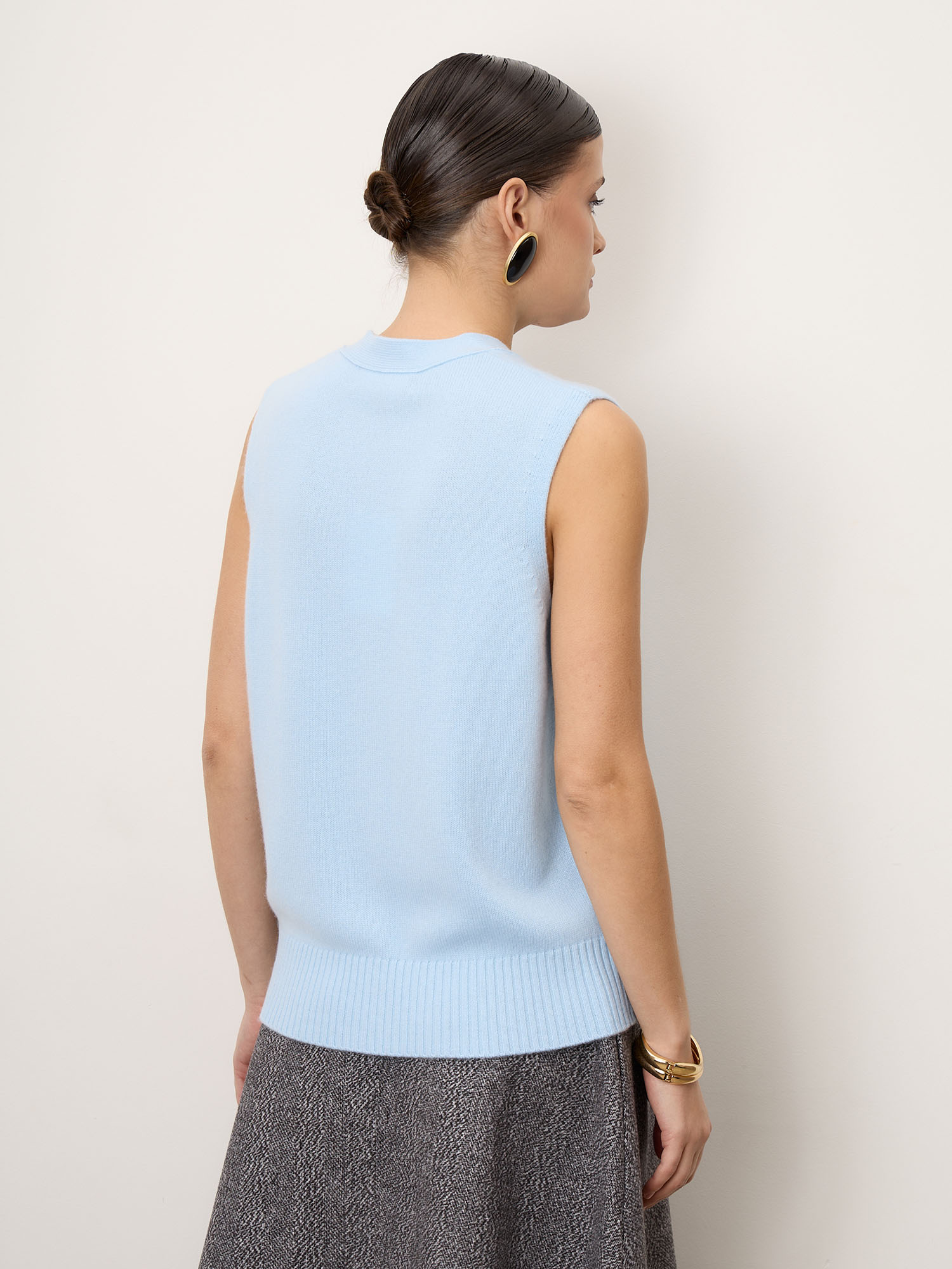 Модель выполнена в виде лёгкого вязаного жилета с V-образным вырезом и застёжкой на аккуратные пуговицы. Гладкая вязка подчёркивает благородную текстуру кашемира. Минималистичный дизайн делает изделие универсальным и элегантным.