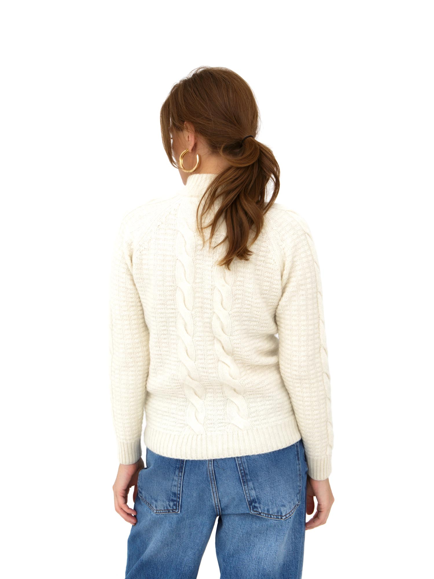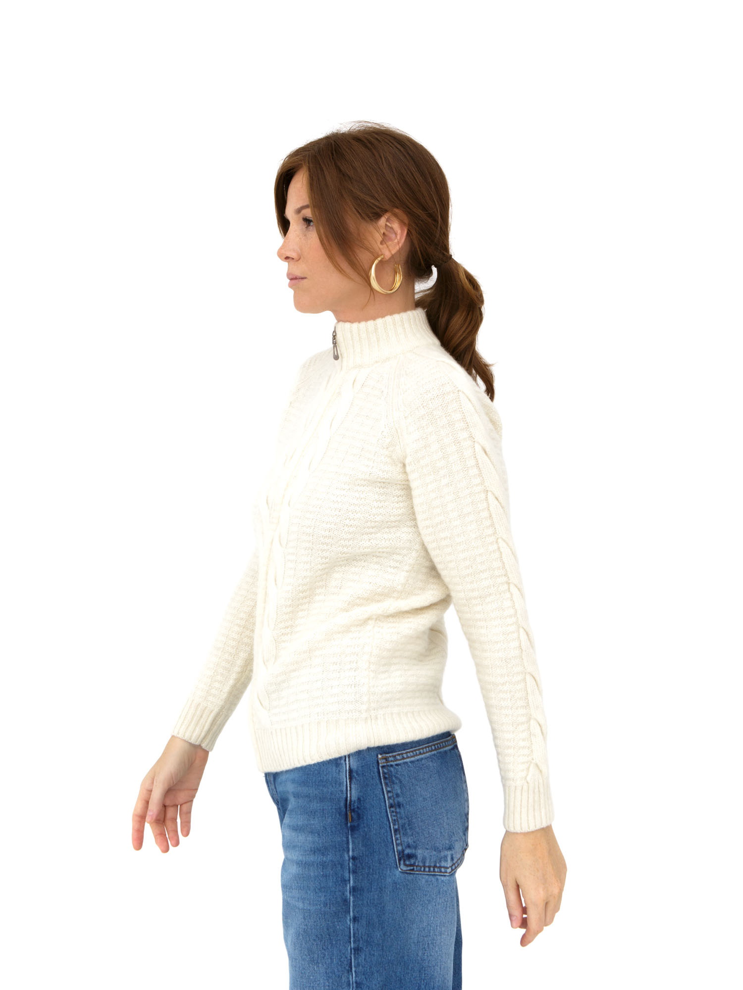 Модель выполнена в полуприлегающем силуэте с застежкой-молнией по всей длине, что обеспечивает дополнительный комфорт и возможность регулировать теплообмен. Высокий воротник надежно защищает от ветра и холода, создавая уютное ощущение в прохладные дни. Классическая вязка с традиционным узором подчеркивает натуральность материала и добавляет изделию стильный текстурный акцент.